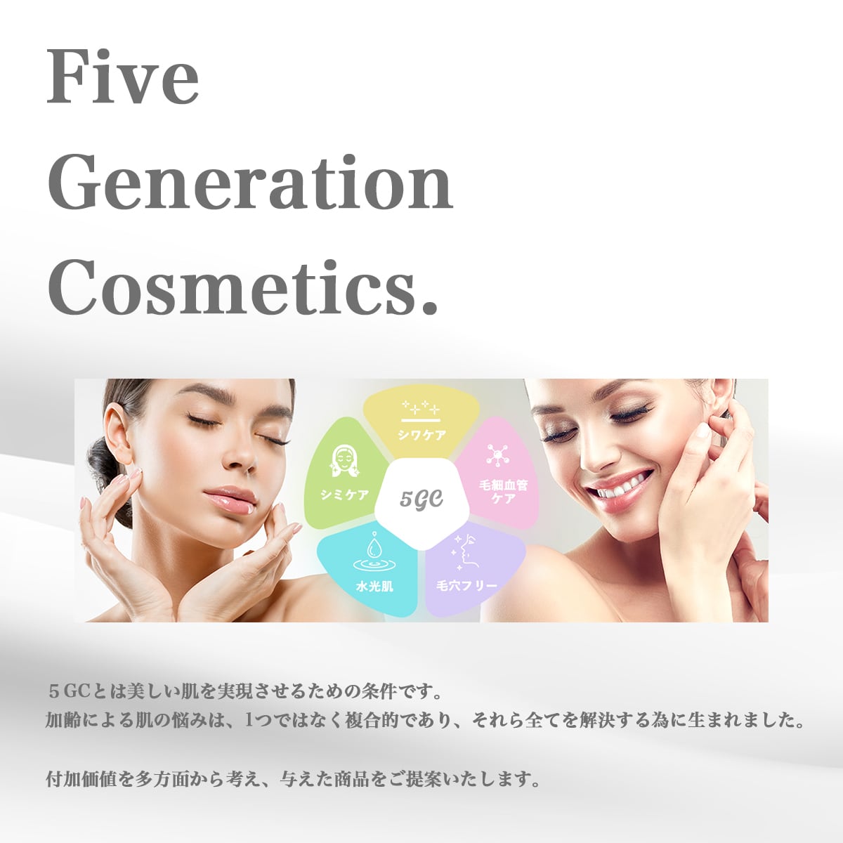 IZ-II SAKURAオールインワン美容液の背後には、5GC(Five Generation Cosmetics®︎)の深い哲学があります。5GCは、お肌の悩みが一つだけではなく、複合的に絡み合っていることに着目し、5つの重要なケア要素にアプローチするスキンケアのコンセプトとして誕生しました。